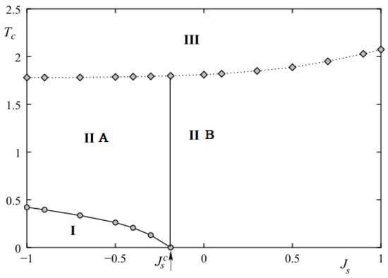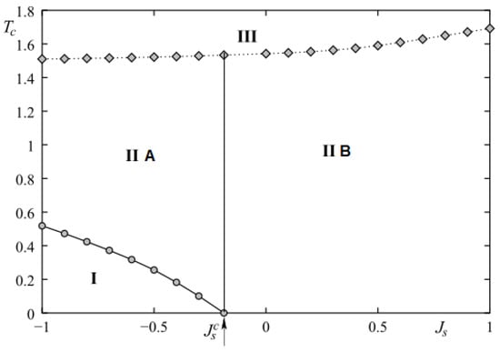 Figure 28 shows the phase diagram obtained in the space . It is interesting to note that the classical phase diagram shown here has the same feature as the quantum phase diagram displayed in Figure 26. The difference in the values of the transition temperatures is due to the difference of quantum and classical spins.
