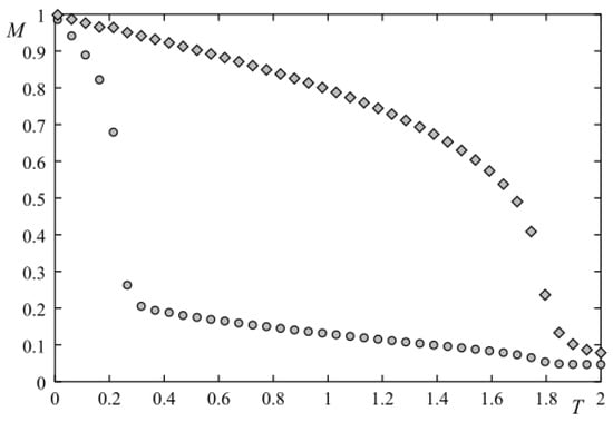 Magnetizations of layer 1 (circles) and layer 2 (diamonds) versus temperature T in unit of for with .