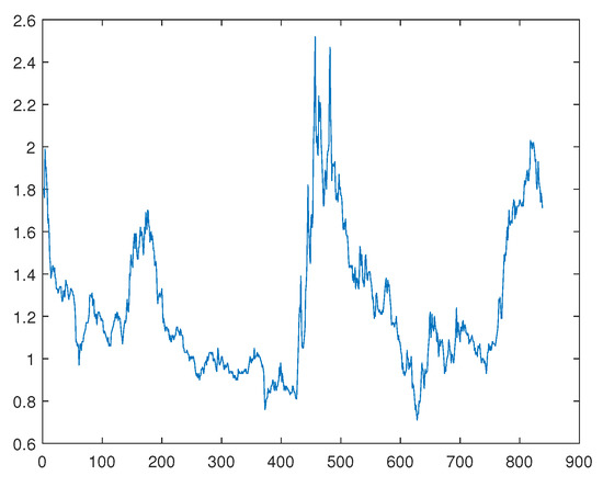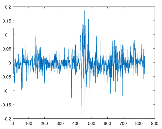 Firstly, we studied the opening price of ST Daji (000564) from 1 January 2018 to 1 January 2022, which has, in total, 837 observations. Let be the logarithms of the opening price of ST Daji (000564) in Figure 1, and , is plotted in Figure 2. Ling [8] makes a self-weighted quasi-maximum likelihood estimate for ARMA-GARCH.