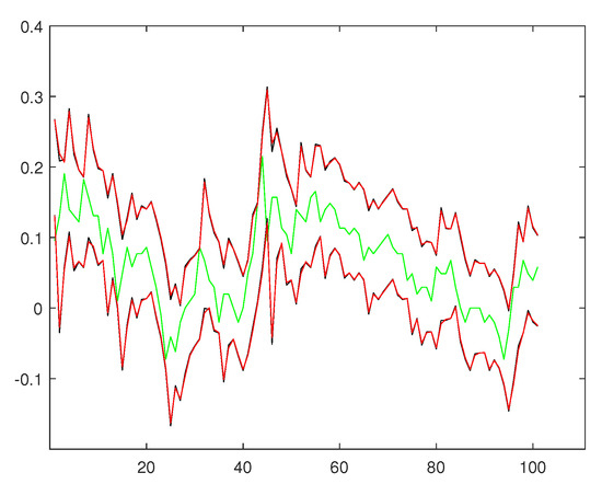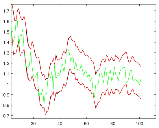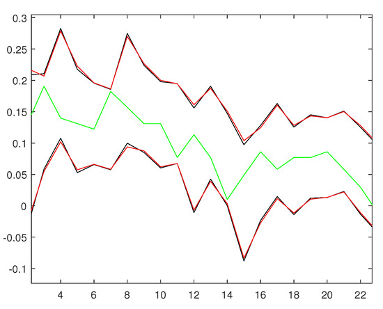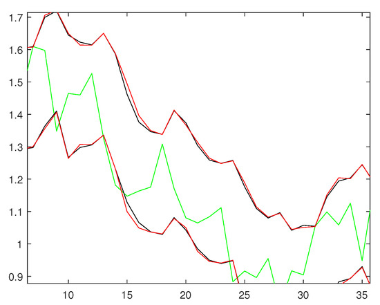 Time series diagram of the data (green line) and 95% forecasting confidence intervals based on models (12) and (13) (red line) and models (14) and (15) (black line), respectively.