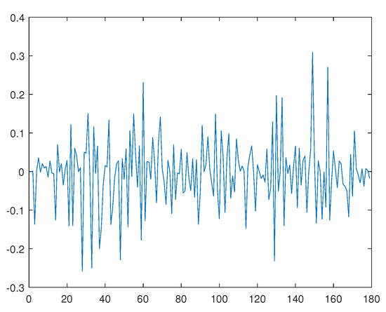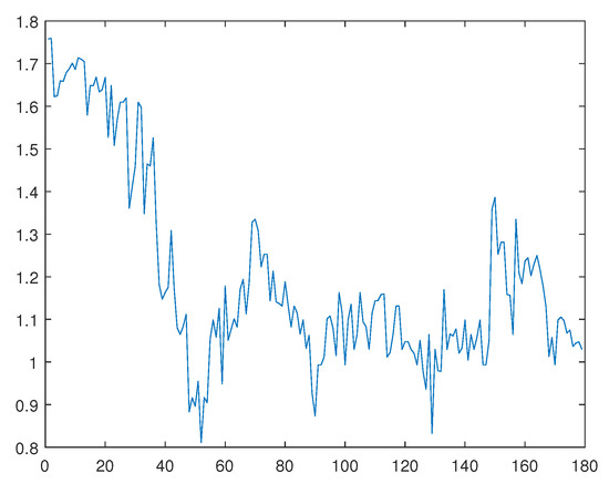 Secondly, we studied the 21-day China Interbank Offered Rate from 2 November 2015 to 8 March 2016, which has 178 observations. Let be the logarithms of the 21-day China Interbank Offered Rate in Figure 5, and , is plotted in Figure 6. Ling [8] makes a self-weighted quasi-maximum likelihood estimate for ARMA-GARCH.
