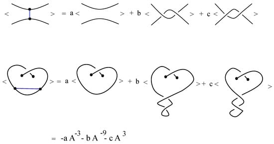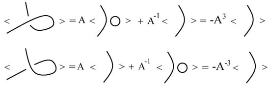 Figure 12, we show the invariance under a rigid bond move of type II. The invariance under the other moves can be shown in a similar fashion. Adding a small curl to a bonded knotoid diagram by a type I Reidemeister move multiplies the double twist bracket polynomial of the diagram by
