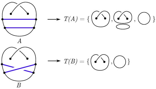Let denote the multi-knotoid diagram formed by performing local replacements for each vertex, where we also remove all unknotted arcs, except if this arc contains both endpoints (marked vertices). We denote by the collection of multi-knotoids for all possible replacements .