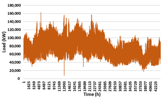 The case study refers to a mix of residential, commercial, and industrial consumers supplied by a high (i.e., 150 kV) to medium (i.e., 20 kV) distribution transformer located within the city of Thessaloniki, Greece. The available load data refer to the period 1 January 2006–31 December 2010. Among them, almost 80% were used as the training set and the remaining 20% served as the test set. More specifically, the training set covers the period from 7 January 2006 to 31 December 2009 and the test set the period between 7 January 2010 to 31 December 2010. Figure 1 shows the time series of the data set. In order to examine a realistic test case, the inputs used by the neural network that provides the official forecasts of the Greek interconnected system were taken into account. The inputs were distinguished into historical loads, temperature, and day-type coding. The load data were provided by the Hellenic Independent Power Transmission Operator S.A. and the temperature data by the Hellenic National Meteorological Service [38,39].