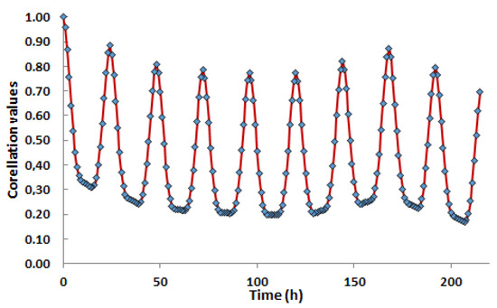The first task was to examine the short-term periodicity of the load. The scope was to select the most correlated lagged load values. Let be the load of the current hour of day Utilizing the Pearson correlation index [40], the relationship between the current load value with its previous values up to 9 days in the past, i.e., -216, were drawn. The corresponding curve is presented in Figure 2.