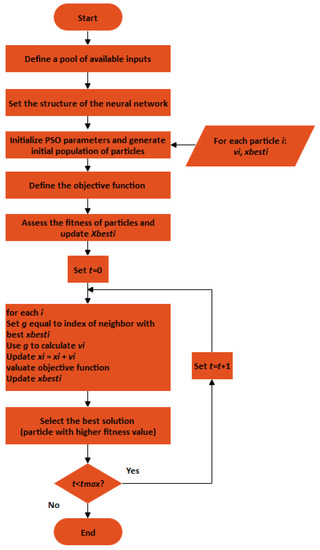 where denotes the -th neuron in the hidden layer and denotes the -th neuron in the output layer. The selection of the number of neurons in the hidden layer was a subject of a sensitivity analysis. In the present study, the number of neurons in the hidden layer varied between 2 and 30, with an increasing step equal to 2. The decision variables of the optimization problem were the weight matrices during training and testing. The weight values indirectly refer to the neurons that would be selected or not to form the reduced set of inputs. Figure 3 illustrates the operation of the input selection process. Regarding Figure 3, is the current position of the particle is the current velocity of the particle is the personal best solution of the particle is the current iteration of the algorithm and is the pre-defined maximum number of iterations. The PSO minimizes (5) via an iterative process. The number of desired outputs is set by the user in advance. The swarm’s size equals the desired number of inputs. The output of the algorithm is a sequence of integers denoting the number of the selected inputs. Figure 3 presents the flow-chart of the input selection phase. It should be noted that the training phase weights update require more time compared with the weights update of the test phase. This relation between the two durations are asymmetrical, i.e., the durations are not proportional.