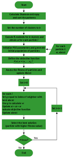 The scope was to derive a reduced set of outputs to result in, ideally, both reductions in required training time and prediction error. A binary coded PSO was formed to indicate the optimal inputs. After the selection of the inputs, the K-medoids/PSO algorithm was applied to split the training set into smaller subsets. The flowchart of the clustering phase is illustrated in Figure 4. PSO is a metaheuristics algorithm that mimics the collective behavior of swarms in search of their food [41]. The term “food” in optimization terms models the solution of the problem. K-medoids is a partitional clustering algorithm that has a similar operation to the K-means; the difference lies in the centers of gravity of the clusters. K-medoids employs the medoids of the clusters, i.e., the patterns whose average dissimilarity to all the patterns in the same cluster is minimal [42]. K-medoids and PSO algorithms are both influenced by their initialization phase. The selection of the load curves that will serve as initial centroids is crucial since they form the initial clusters and define the subsequent clustering procedure.