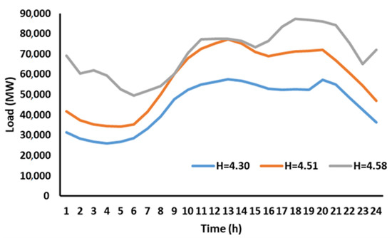 As an example of load curves with different entropy values, Figure 5 shows three daily load curves of the test set. The load curve with displays high volatility in comparison with the rest. The load curves of Figure 5 can serve as the initial centroids for the K-medoids if the clustering was applied only to the load data set. The K-medoids/PSO is applied in the set The outputs of clustering are the cluster labels, i.e., integer values that are assigned to each training pattern. Let be the centroids of the training set, where is the indicator denoting the number of clusters in the training set. The fitness function of the PSO refers to the sum of squared errors between patterns and centroids :