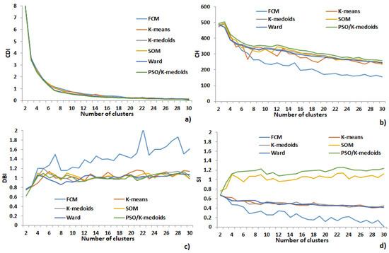 The CDI is a ratio of a well-separation metric to a compactness one. While the number of clusters increases, robust clustering should lead to lower values of the CDI. While the number of clusters is increasing, the clusters become more compact, i.e., they contain load curves with more similar characteristics. In Figure 6, the PSO/K-medoids results in lower CDI values followed by the Ward hierarchical algorithm. The last in the competition is the FCM. The CH indicator is a measure of compactness. Since the denominator needs to be minimized, the better clustering corresponds to large CH values. Again, the PSO/K-medoids outperforms all the rest. As for the second place in the competitions, there are mixed results; K-means appears more suitable for a low number of clusters and the K-medoids for a medium-range number. For a large number of clusters until 30, SOM is proposed. As in the case of the CDI, fuzzy clustering presents poor performance. Like the CDI, the DBI measures both well-separation and compactness. The best algorithm should lead to lower values. The PSO/K-medoids leads to lower values in mist number of clusters followed by the Ward algorithm. Finally, the SI indicates the proposed clustering algorithm as the winner of the competition. The SOM is the second in the list whereas the FCM fails to provide robust clustering.