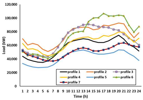 Considering the CDI curve as drawn by the PSO/K-medoids algorithm, the optimal number of clusters can be derived using the knee point detection method [48]. The optimal number of clusters is seven. Thus, the 365 daily load curves are optimally grouped together into seven groups. Figure 7 presents the load profiles of the clusters. The day-type distribution per cluster is registered in Table 3.