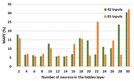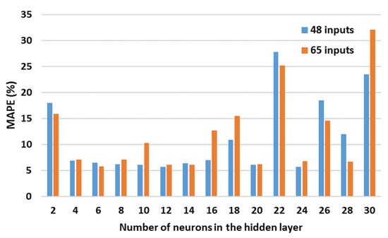 where is the total number of days and and are the actual and forecasted loads of day D, respectively. The FFNN is trained with a variable number of neurons in the hidden layer and for each number the MAPE is checked. The comparison of the two models is illustrated in Figure 8. The figure refers to the MAPE of the test set. The test set is used for the model’s predictability assessment. For the greatest number of neurons, the reduced set of inputs leads to lower errors. The ANN with the 65 inputs results in the lowest MAPE = 5.77% at six neurons, whereas the one with the 48 inputs results in the lowest MAPE = 5.64% at 12 inputs. The average MAPE of the 65 inputs is 11.84% whereas that of the 48 inputs is 11.12%.