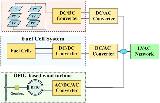 Distributed generation units are usually connected to the main grid via power electronic converters. For example, a wind turbine produces AC output power that can either be connected directly or via AC/DC/AC converters to the main grid. The low voltage AC networks can be connected to wide area networks through transformers and AC loads can also be connected directly to the network. However, DC loads require power electronic converters to connect to the AC network. On the other hand, solar photovoltaic arrays have DC output power and are connected to AC networks through inverters. Figure 1 shows multiple DG units connected to a low voltage AC network [8].