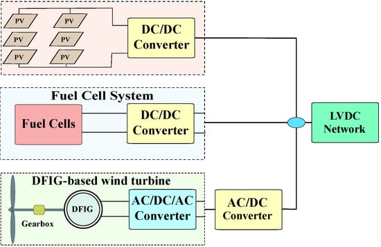 Low voltage DC (LVDC) microgrids are being increasingly deployed for electricity supply to industries and and commercial buildings. In the future, it is expected that DC distribution systems will be operated in alongside the AC systems to feed all DC electrical appliances and machines. The operation of these parallel systems will be optimally controlled by an energy management system (EMS). Solar PV systems deployed in modular scale are beneficial for DC power generation. In addition, where the primary energy source to the LVDC network is an AC generator, AC/DC converters become essential. Additional elements in the LVDC network include energy storage and DC loads. Figure 2 shows a view of a LVDC network. Features that make LVDC attractive for a higher scale of application are its simplicity and high system efficiency; for this reason, LVDC is expected to increase in popularity [8].