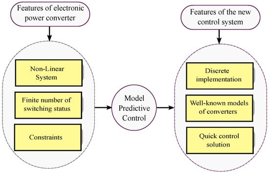 Model predictive control (MPC) is gaining increasing attention by control system researchers for applications, including energy conversion and process control. In power electronics applications, MPC can be divided into two groups: continuous control set MPC (CCS-MPC) and finite control set MPC (FCS-MPC) [16]. The main difference between these two groups lies in the type of modeling, implementation, and complexity [17]. MPC with a continuous input set is defined in the context of the model in the state space for the electronic power converter. Accordingly, the input in the model will be a continuous parameter that is limited in a range [18]. Furthermore, the switching frequency is constant and the control strategy will be applied to the system through a modulator. This type of predictive control is commonly used for other systems and is not specific to electronic power systems [19]. Using hybrid modeling, the input will be continuous and limited, and the switching frequency controller will be fixed for implementation. Model predictive control with finite input sets uses the discrete nature of electronic power converters to reduce computations and data processing time [20]. FCS-MPC has many advantages and special capabilities for power electronics-based energy optimal control. These types of controllers are a suitable solution for researchers in the field of industry and, recently, a lot of research has been conducted in different fields such as motor drives, power quality, and wind and PV energy conversion applications. Figure 3 shows the characteristics of power electronic converters and MPC-related specifications.