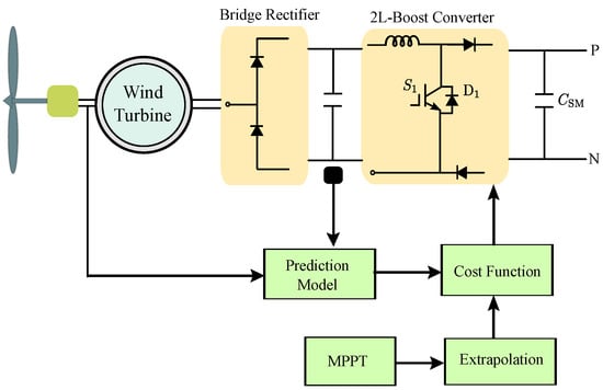 In [33], a predictive control scheme was proposed for the low-voltage ride-through of wind turbines, which are driven by permanent magnet synchronous generator (PMSG). The problem in this study employs the generator-turbine rotor inertia for the storage of excess energy during grid voltage drop. In particular, the converter system includes a three-phase diode-bridge rectifier, three-level boost converter and neutral-point-clamped (NPC) inverter. In [34], through mathematical considerations of uncertainties and non-linearity, MPC-based wind energy conversion for a PMSG was achieved. The resulting algorithm is robust to load and parametric uncertainties. In [35], a robust continuous time predictive control method for direct control of DFIG power is presented. In this method, Taylor expansion was used to predict stator currents in the synchronous reference frame for three operational conditions: synchronous, sub-synchronous, and super-synchronous. The simplest topology for the wind turbine side is using two-stage power converters consisting of one diode rectifier and a boost converter, as shown in Figure 4. The first stage (rectifier) converts energy from ac to dc without requiring any control signals. The second stage includes controllable power switches to realize maximum power-point tracking (MPPT) and help improve the DC link voltage stability [36]. The MPC scheme integrates sub-costs in an overall cost function with weighted control objectives, as shown in (2)–(4). In (4), the first term tracks inductor current, the second regulates dc-link voltage balance, and the weighted third term minimizes the switching effort. The control system implements the MPPT goal by the control of the wind turbine angle speed.
