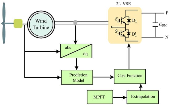 where , are the reference inductor current and the switching signal, respectively. The developed wind turbines can generate high power with increased voltage at the wind generator output. Thus, the conventional two-stage converters that are designed for low-voltage level applications are adapted to these types of wind systems. High voltage standing capability leads to the use of three-level boost converters and rectifiers with series diodes, as illustrated in Figure 5. In this topology, the wind turbine side converter has to regulate the inductor current for MPPT realizing and guarantee the voltage balance of capacitors. Therefore, three sub-cost functions are integrated, as given by (4). The variables are controlled and the optimum switching is realized. The balance of the capacitors voltage depends on the injected power to the grid. This Virtual Load Currents block is built to model the rectifier virtual load behavior. Two reference variables are generated by the MPC module [37]. To improve the efficiency, one-stage power electronics systems are recommended by the researcher for grid-connected wind generation, as shown in Figure 6. The dc-link current is not available for this topology. Thus, the delivered ac current by the generator is measured and the measured ac current is transformed from ABC to DQ frame. The generator must inject the real power. Thus, both the q and d component must be controlled and the fitness function is defined to conduct this goal [38].