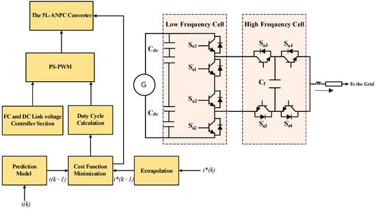 In [56], a hybrid MPC (comprising high-frequency and low-frequency) is proposed to solve the challenges of the classical and duty-cycle-optimized MPC techniques applicable for the active neutral-point-clamped (ANPC) converters. The main advantages of this technique are fixed switching frequency for the high-frequency stage of the converter and reduction of the computational burden. The power converter is divided into two stages: the high-frequency side and the low-frequency side. The capacitor voltage balance and improved performance of the converter over linear control were achieved. The proposed structure is shown in Figure 8.