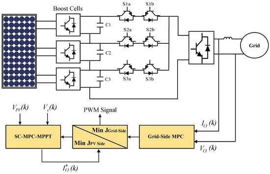 The application of MPC techniques for a seven-level multi-level inverter was investigated by [57] for PV power generation systems. The seven-level multi-level inverter is realized by three stages, as shown in Figure 9. The first stage is responsible for controlling the dc-dc converters using MPC-based MPPT. The switching states are sent to the dc-dc converters’ switches and a reference current for the grid-side stage is generated. Three bidirectional solid-state switches are employed in the second stage to actuate the desired output voltage levels. To guarantee the generation of all voltage levels, only one arm must be triggered during every control time interval. The MPC technique is also applied to control the second stage’s switches. Finally, the H-bridge changes the polarity in each half-cycle of the grid frequency. The efficiency of MPPT and transient response are improved.