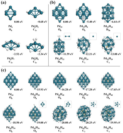 The optimized most stable structures of Pdn and PdnHm (n = 6, 19, 44) clusters. (a) Pd6 and Pd6Hm; (b) Pd19 and Pd19Hm; (c) Pd44 and Pd44Hm. The symmetry group of the Pd sub-structure of each cluster was labeled. The structures of the core Pd atoms of representative Pd19Hm and Pd44Hm clusters were illustrated in the inserted small squares. The relative formation energies (ΔGf) relative to the GM of pure Pd cluster and gaseous H2 are listed at the bottom-right corners of the structure. Dark blue balls: Pd; small white balls: H.