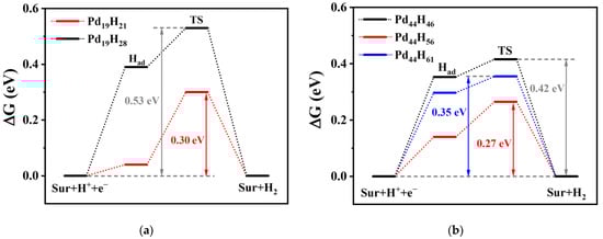 There are two possible reaction routes for HER: One is the reaction of surface H with a proton (Heyrovsky route: Had + H+ + e− → H2), and the other is the coupling of two surfaces H (Tafel route: 2Had → H2). Our previous studies [33,34,35] have shown that the Tafel mechanism is a key pathway for platinum group metal-based HER catalysts, and the free energy barrier of H-H coupling (ΔGa H-H) is a good indicator for comparing the activities of different HER catalysts. In Figure 2, it shows the reaction profiles of H-H coupling reactions on representative H-adsorbed Pd19 and Pd44 clusters under reaction conditions. For all these clusters, the reaction takes place between a surface adsorbed hydrogen atom and an additional hydrogen atom adsorbed on the surface with positive ΔGad. The Volmer step occurs first with one proton from the solution to adsorb on the surface (Sur states) and with a simultaneous electron transfer, * + H+ + e− → H*, to form an additional H atom adsorbed state (Had). Moreover, this additional H reacts with the nearby surface H to achieve the transition state (TS). The TS is a [H-H] complex nearby the Pd catalytic site with the H-H distance in the range of 0.80–1.40 Å. It should be mentioned that the reaction barriers of the structural reconstruction are generally ~1 eV higher than the H-H coupling. Therefore, HER will take place preferentially in kinetics, but the reconstruction of the cluster is still possible under long-term reaction conditions. As an example, the reaction profiles of the first structural reconstruction step of the octahedral Pd44H60 cluster are shown in Figure S3.