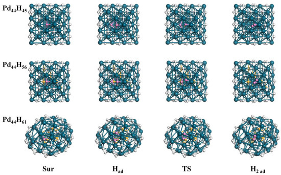 Optimized structures of the key reaction intermediates of HER on Pd44Hm (m = 45, 56, 61) clusters. Dark blue balls: Pd; small white balls: surface H; small yellow balls: interior H; small pink balls: reacting H.