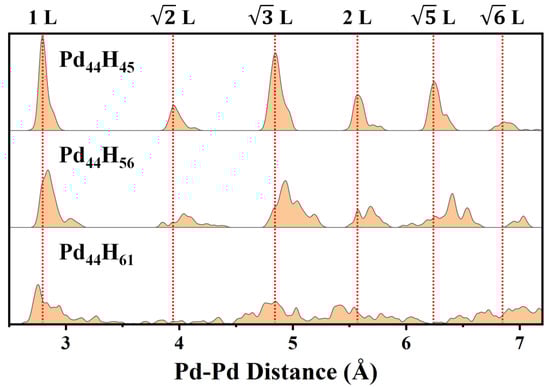 Pd-Pd distance distributions for Pd44H45, Pd44H56, and Pd44H61.