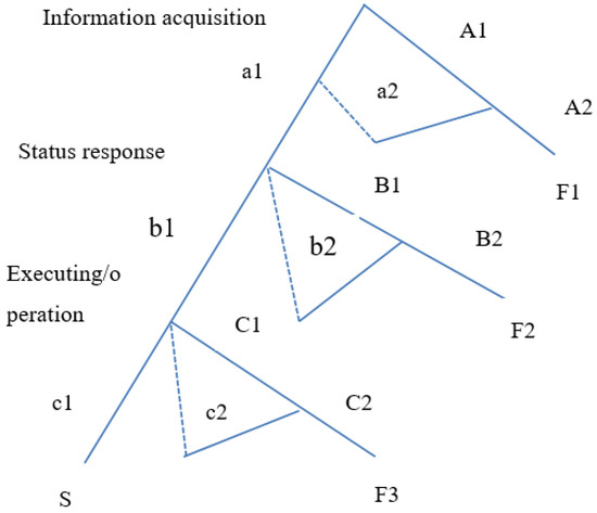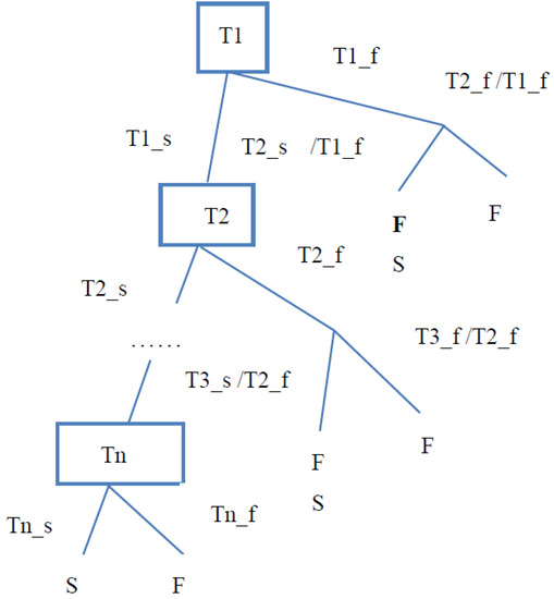 In Figure 3, T1, T2, Tn represent the first, second, nth stages of task decomposed, respectively; T1_f, T2_f, T3_f denote task cognitive failure in the first, second, third cognitive phase, respectively; similarly, T1_s, T2_s, T3_s, Tn-1_s, Tn_s respectively represent that the cognitive process is successful when the task processing stage is first, second, third, (n − 1)th, nth; S indicates task processing success; F represents task processing failure.