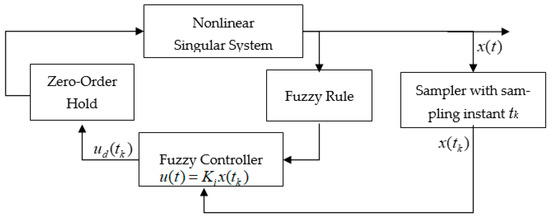 TS fuzzy models play a key role in approximating many complex nonlinear systems with a small error. With the development of fuzzy control theory, sampled-data control has been widely used in fuzzy systems using the TS fuzzy model ([35,36]). In reference [35], a desired sampling-state-feedback controller was designed through the Lyapunov method, which effectively improved the system’s performance. The authors of [36] studied the quantization problem of fuzzy sampled-data systems by an improved input delay method and Wirtinger integral inequality, with the design method of the corresponding quantization controller given. In reference [37], an input-delay method and the constructed Lyapunov–Krasovskii function was improved, with a new criterion given to guarantee the stabilization of a fuzzy system, and the conservatism of the system was also reduced. The authors of [38] further improved the delay-independent Lyapunov function, with the stability of fuzzy sampled-data systems also studied. By combining the interactive-convex-combination method and Wirtinger inequality, less conservative stability results can be obtained. In [39], the dissipative stability for fuzzy systems with sampled data control was studied. To improve the adaptability of the controller, internal and external factors of communication delay and aperiodic sampling modes were considered. In [40], a quantized sampled-data controller for a fuzzy system, under random network attacks, was studied, and a new delay product relaxation condition was introduced, which can obtain relaxation constraints for delayed information. In [41], the aperiodic sampled-data control problem for chaotic systems with TS fuzzy models was discussed. However, the references mentioned above are only applicable to the normal fuzzy system, although a singular system more excellently describes some physical systems (rather than normal systems). Few research findings have reported good handling of the sampled-data problem for nonlinear singular systems. In fact, the research gaps are: