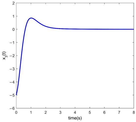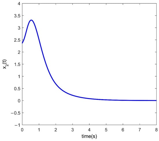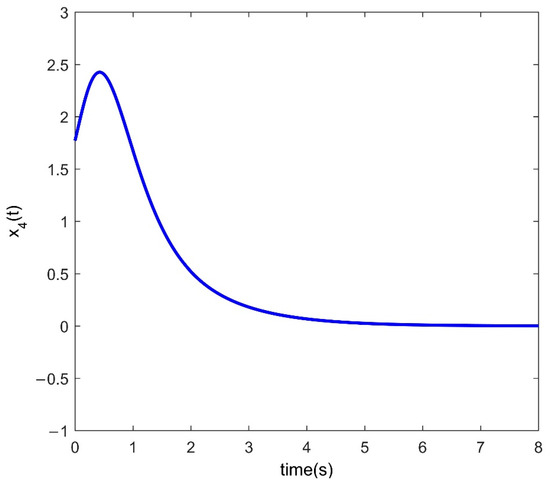 The initial state is , and the external disturbances are , the responses curve of the system’s state are shown in Figure 2, Figure 3, Figure 4 and Figure 5, respectively. Take Figure 3 as an example; Figure 3 is the responses curve of the trailer’s angle (). The initial state is , and the expected stable state is . From Figure 3, this shows that after about 1 s of peak time and 4 s of stable time, the system state achieves the desired target, which shows that the system state is stable. Therefore, from Figure 2, Figure 3, Figure 4 and Figure 5, this illustrates that the state variables tend towards zero in a short time, which further illustrates that the proposed sampled-data controller makes the state variables stable and achieves good control performance under external disturbance.