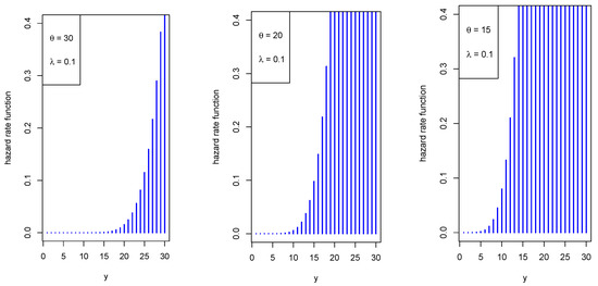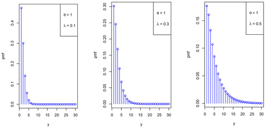 A distribution with the pmf given in (6) will be denoted as LZTPD(). For , the LZTPD() reduces to the ZTPD (see [24]). As a result, we can say that the LZTPD() is a generalization of the ZTPD. Figure 1 and Figure 2 display the graphical representation of the pmf of the LZTPD for different parameter values of and .