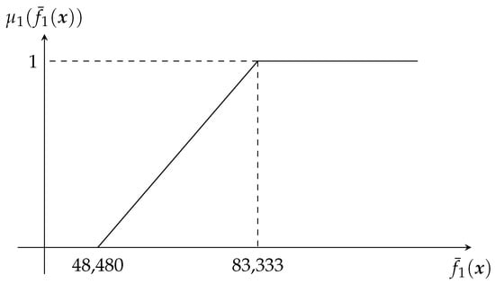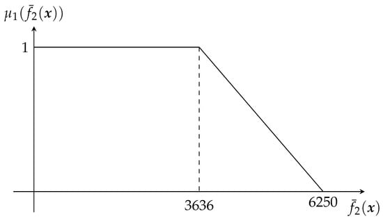 For the interactive process, we first consider the inexactness of the DM’s judgment of the importance of each objective in model (9), so we construct a membership function for each objective. We denote as and assume that should be not greater than a certain value is equivalent to fuzzy min, should be not less than a certain value is equivalent to fuzzy max. The crisp objective functions in model (9) can be indicated by the liner membership functions , defined by the following equations, as shown in Figure 3 and Figure 4.