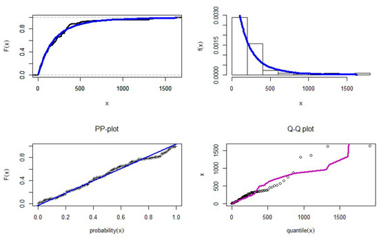 In this section, we apply real data to demonstrate the value and adaptability of the APW distribution using various schemes and sampling strategies. The data set, which was used in [22], corresponds to the days between 109 consecutive coal-mining incidents in Great Britain. Measures (AIC, CAIC, BIC, and HQIC), CVM, AD, Kolmogorov–Smirnov (KS), and p-values for the data set are included in Table 8 along with the MLEs and accompanying standard errors (SEs) of each model parameter. Figure 1 shows the relative histogram with the fitted APW distribution, the fitted APW CDF plots with empirical CDF, and the QQ and p-p plots of the data set. The outcomes in Table 8 are also supported by these graphical goodness-of-fit techniques in Figure 1.