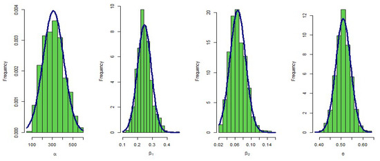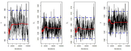 Figure 2 shows trace plots of the posterior distributions of parameters tracking the convergence of MCMC outputs. It shows how well the MCMC process converges. Figure 3 also shows the histograms for the marginal posterior density estimates of the parameters based on 10,000 chain values and the Gaussian kernel. The estimations clearly show that all of the generated posteriors are symmetric with respect to the theoretical posterior density functions.