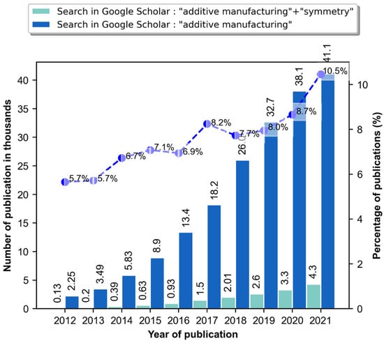 Evolution of scientific production on the subject of additive manufacturing and the number of articles in which symmetry is mentioned (source Google Scholar).