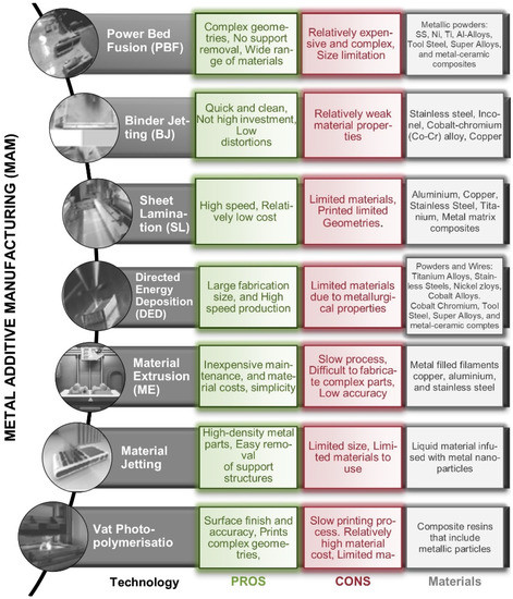 Furthermore, today, in many cases, metal additive technologies are still limited to prototyping, production of small, high value-added parts, and repairs [44]. To replace traditional manufacturing methods and to become a core element of Industry 4.0, these technologies will need to demonstrate that they can overcome the barriers they face and adapt to mass production.