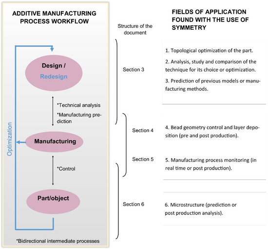 After this introduction, the article is organized into a second section describing and classifying metal additive manufacturing techniques and symmetry as a general concept and fundamentals within MAM. Next, the relationships of symmetry according to the workflow are developed in four different sections, examining the entire manufacturing process. Section 3 delves into the literature review of the relationship found between design or redesign and symmetry in additive manufacturing processes, in addition to other related applications. Section 4 reviews the studies related to the symmetry and the geometric shape of the bead and the deposited layer. Section 5 presents its use in monitoring systems in the manufacturing stage, and Section 6 addresses the symmetry in the final part and the inherent search for means to control the properties of the part that are related to the microstructure. Finally, Section 7 contains a synthesis as a conclusion and Section 8 outlines challenges and future lines of action.