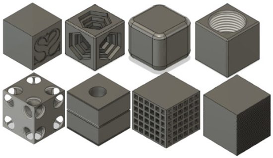 Another application that has been found in design is the use of symmetrical models or specimens for various studies. This application has not been observed to be very widespread, but we believe that it can be very useful, for example, to make a comparative study between additive manufacturing techniques of metallic material. This was the case in a previous study [60], although not applied to metallic materials, in which fused deposition modeling (FDM) technology was compared with masked stereolithography (MSLA). The symmetry of the models allowed them to check the quality of the prints on each side in three planes. All the cube-based models were symmetrical in point, axis, and plane. As shown in Figure 5, using this wide range of geometrically patterned models, they were able to analyze the different properties of both techniques by performing an in-depth comparison.