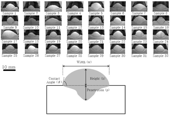 Cross-sectional view of the deposited coating tracks with the process parameters represented in different sections (32 samples) where the importance of the geometry and its control and comparison process can be observed [88] (Reprinted with permission from [88] 2017 © The Korean Welding and Joining Society).
