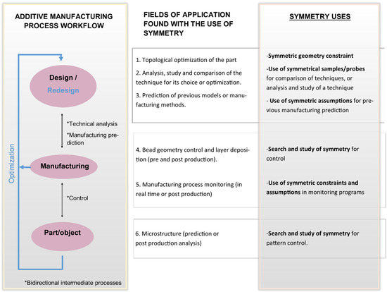 Six different fields of application of symmetry within additive manufacturing of metals were found; they are listed and detailed in Figure 3 with their corresponding stage of the additive manufacturing flow.