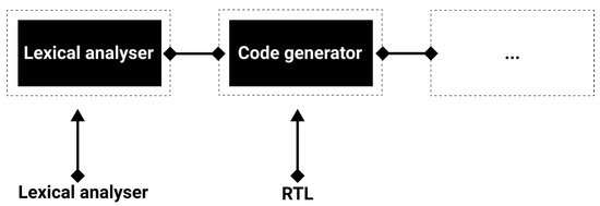 The compilation process is naturally sequential (each phase happens just after the previous one), as the input of each stage fully depends on the output of the previous one. Further, it is almost impossible to use parts of a compiler concurrently with other tasks when it is busy with other compilations by multiple users or applications. This means when a compiler is processing code, practically speaking, we cannot use modules for other purposes [4]. With architecture provided on the cloud, we can use each module of the compiler at any time. As an example, when a lexical analyzer is parsing code and busy with Abstract Syntax Tree (AST) generation, we can use code generation as an independent microservice with another intermediate representation (IR) as input. Figure 1 below shows such a scenario.