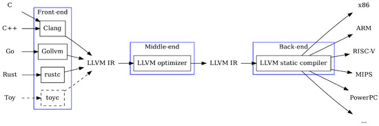 - Park, C.; Han, M.; Lee, H.; Kim, S.W. Performance comparison of GCC and LLVM on the EISC processor. In Proceedings of the International Conference on Electronics, Information and Communications (ICEIC), Kota Kinabalu, Malaysia, 15–18 January 2014; pp. 1–2. [Google Scholar] [CrossRef]