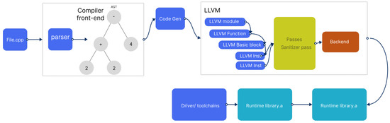 LLVM is quite flexible due to the separation of the front-end, middle-end, and back-end. Due to this flexibility, it is quite possible to write a fully customized sanitizer for a specific language. We can write a sanitizer as a pass in LLVM to modify or analyze IR tuples. LLVM pass manager is responsible for attaching the newly written sanitizer as a pass to the compilation process. Figure 4 shows such a process.