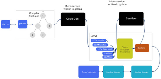 As we can see, the sanitizer pass is tightly coupled with the LLVM tool-chain. With the proposed architecture, we break down this dependency and make it possible to write sanitizer passes by a fully separated microservice. Even though we have the pass in the middle of the process, we simply use it to send the instruction to the out of the LLVM tool-chain process. Then we return it to the compilation pipeline, as shown in Figure 5.