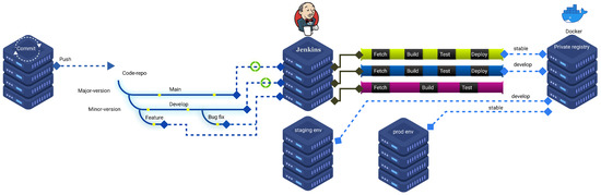 We have prepared a fully automated CI/CD pipeline for this purpose. Each microservice is hosted on a separate repository. The repositories are connected to our builder system (Jenkins) as multi-branch pipelines. With these multi-branch pipelines, we have different pipelines for different branches. Overall, there are two major branches: Develop and Main. Bypassing the Develop branch pipeline, we tag the containers as “develop” and push them to a private Docker registry. From the other side, we deploy and version the containers from the Main branch with the tag “stable” and deploy them in the production environment. Figure 6 reveals such a process.