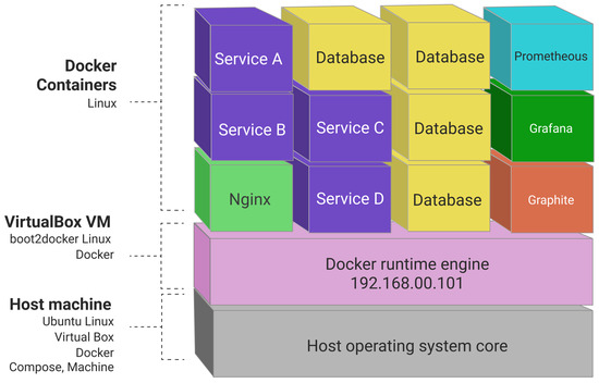 Today, encapsulation of an application as a single and independent package of software that can bundle application codes together with all of the dependencies, libraries, and configuration files needed to run is possible with containerization. To do so, run-time engines (e.g., Docker) should be installed on each node of a cloud cluster (master and worker nodes), which creates a condition for the containers to share a single operating system kernel inside the same node (independent server) with all other containers. Figure 9 represents an example of a containerized application that contains several independent microservices and open-source services.