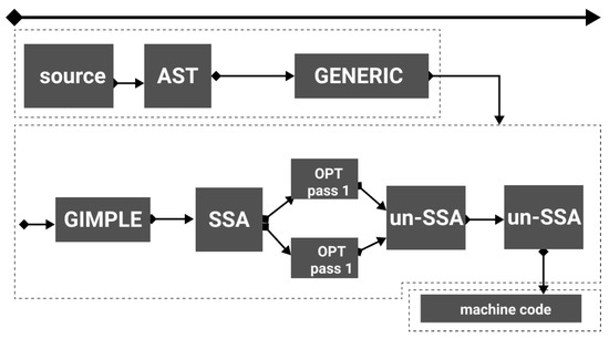 - Bokan, D.; Ðukić, M.; Popović, M.; Četić, N. Adjustment of GCC compiler frontend for embedded processors. In Proceedings of the 22nd Telecommunications Forum Telfor (TELFOR), Belgrade, Serbia, 25–27 November 2014; pp. 983–986. [Google Scholar] [CrossRef]