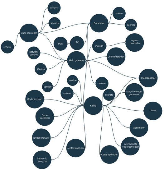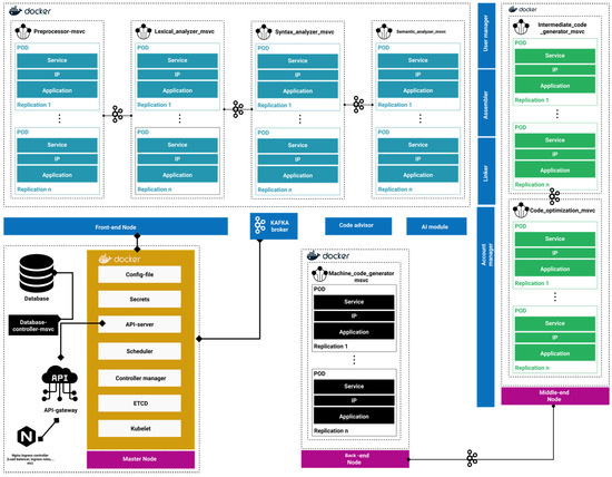 In the proposed approach, we represent the phases of compilation as different microservices plus include other microservices such as a linker, assembler, code advisor, database controller, and user manager (Figure 11).