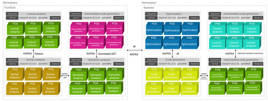 In this model, each phase of compilation is executed separately as an independent service. The output of each microservice is transferred to the Kafka microservice (distributed event streaming platform). The aforementioned architecture focuses on Google Kubernetes container orchestration technology [24]. Kubernetes is an open-source project that provides container orchestration to provision multi-node cloud clusters. With this technology, we deploy the microservices as independent containers using Docker as a containerization platform. With this model, we can have hundreds or even thousands of container replications (pods).