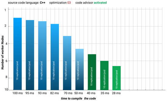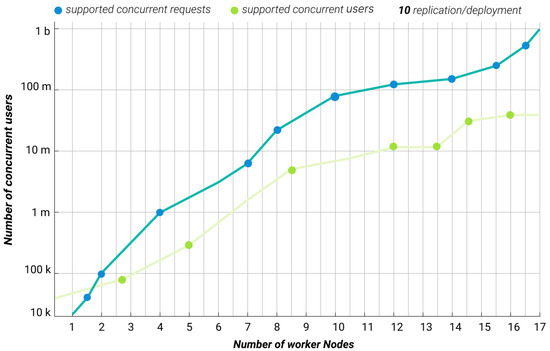Another experimental result is provided in Figure 19. By increasing the number of worker nodes joined to the cluster, the number of concurrent requests grows, and the number of concurrent users that the server can handle also increases. Server downtime decreases, and compilation speed increases.