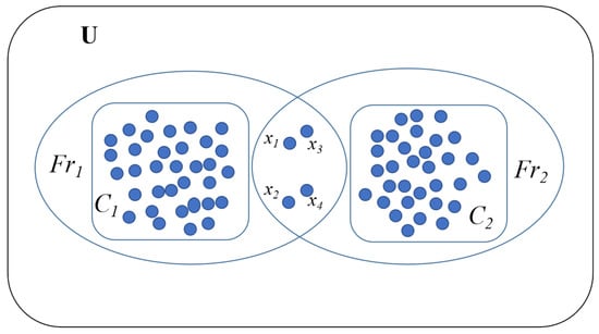 Given a set of data objects , is a finite set of clusters, and U is divided into k classes. The idea of three-way clustering is to use a pair of sets to represent each cluster. This pair of sets consists of a core region (Co), a fringe region (Fr), and a trivial fringe (Tr) []. The results of three-way clustering can be represented as the following family of clusters: